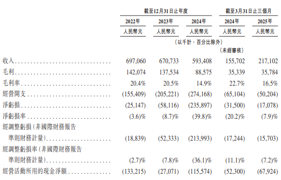2022年、2023年、2024年、2025年1-3月,挚达科技的收入分别为6.97亿元、6.71亿元、5.93亿元、2.17亿元;净亏损分别为2514.7万元、5811.6万元、2.36亿元、1707.8万元;经调整亏损(非国际财务报告准则财务计量)分别为1883.9万元、5233.3万元、2.14亿元、1570.3万元;经营活动所用的现金净额分别为1.33亿元、2707.1万元、1.16亿元、6792.4万元。